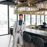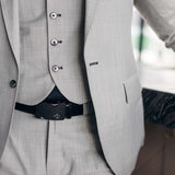 This look pairs The Slate suit’s cool, structured fabric with a black silk-like shirt, creating a tonal harmony that exudes refined strength and subtle edge. Crafted for the man who moves with assurance and understated style, it’s a statement of confident modernity.