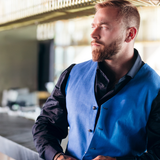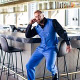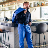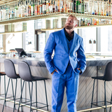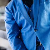This look pairs the rich, bold blue of our linen suit with a sleek black shirt, crafting a striking and contemporary contrast. This ensemble exudes effortless confidence and modern sophistication, perfect for evening events or moments that call for refined authority. A statement of subtle power and timeless style.