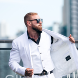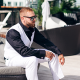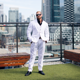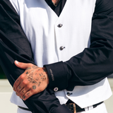 This look contrasts the striking brightness of our white linen suit with the sharp depth of a black shirt, creating a bold and contemporary silhouette. Sleek, confident, and full of presence, it’s a look made for warm nights, standout moments, and the man who owns his style with quiet certainty. Refined, daring, unmistakably modern.